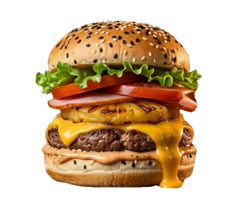 Carne, queso americano, piña, jamón, jitomate, cebolla lechuga y aderezo calavera.