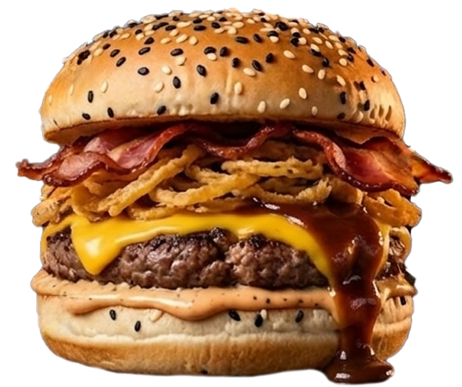 Carne, queso americano, tocino, cebolla crispy, BBQ y aderezo calavera.