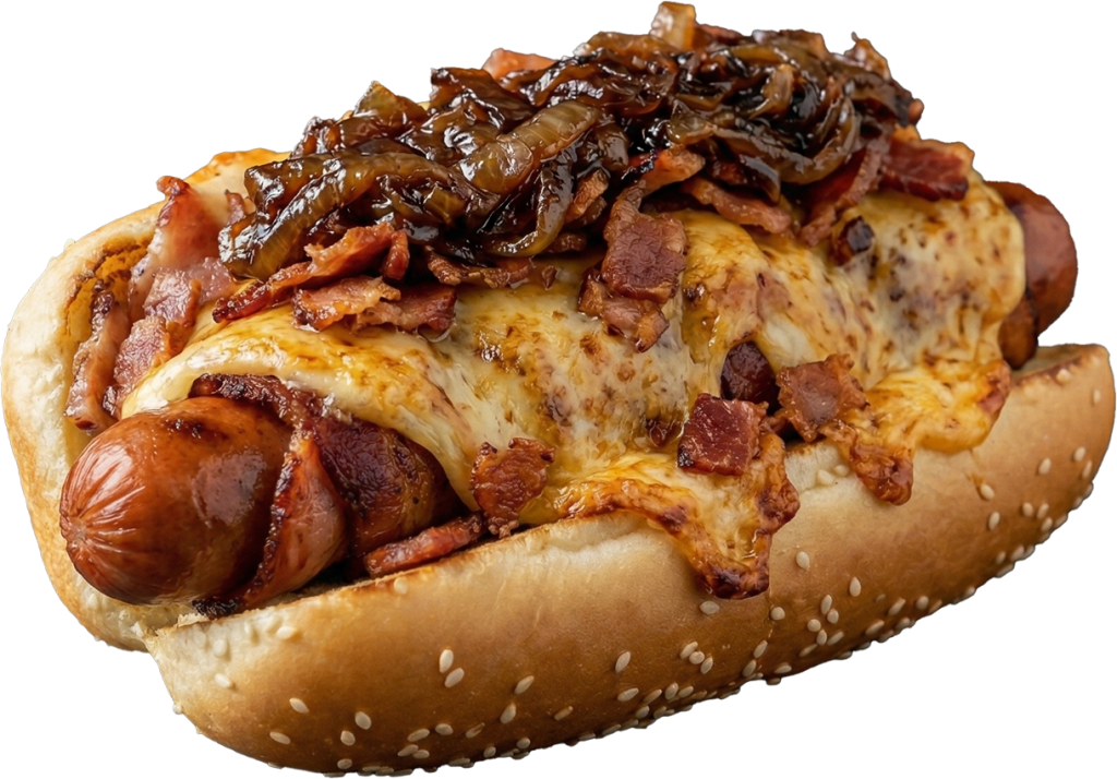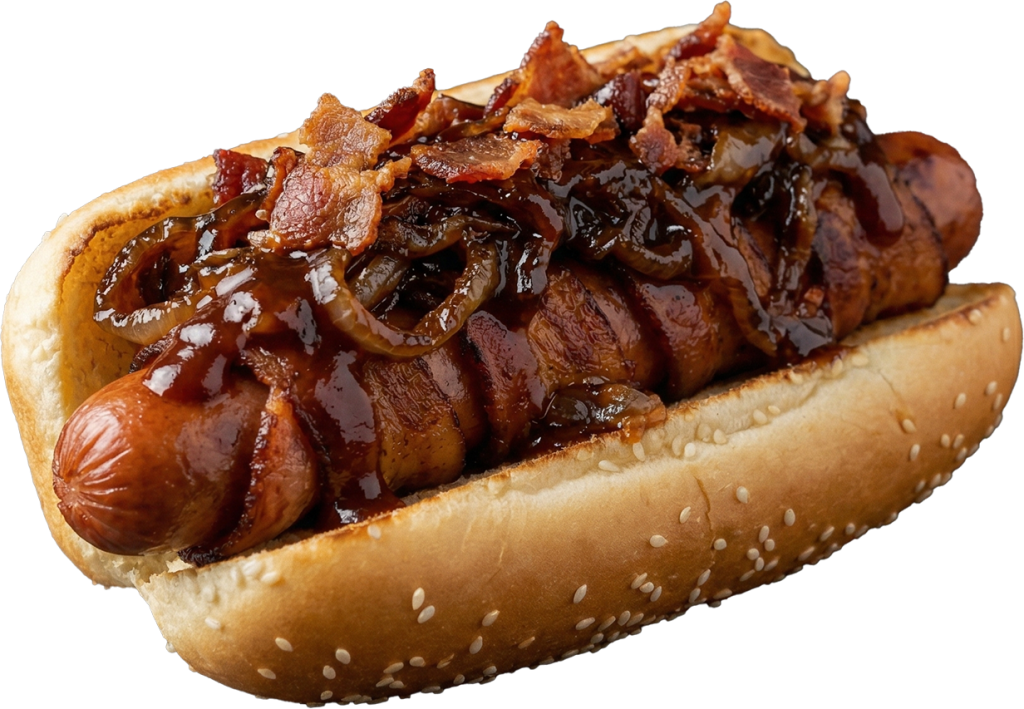 Salchicha envuelta en tocino, tocino extra, cebolla caramelizada, BBQ.