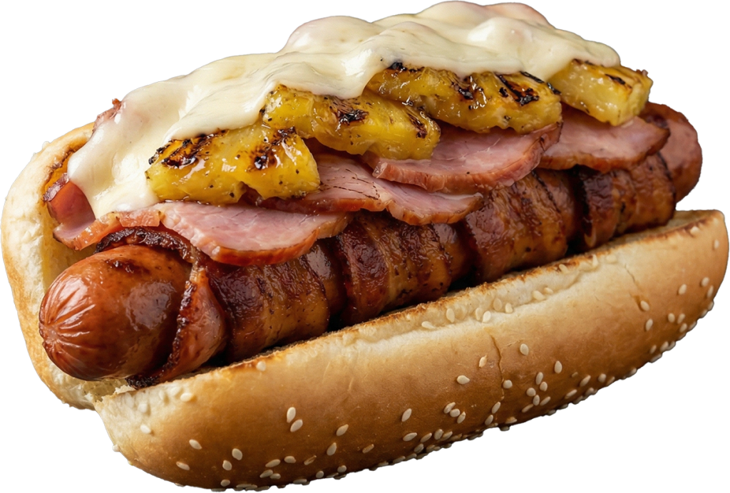 Salchicha envuelta en tocino, jamón ahumado, piña y gouda.