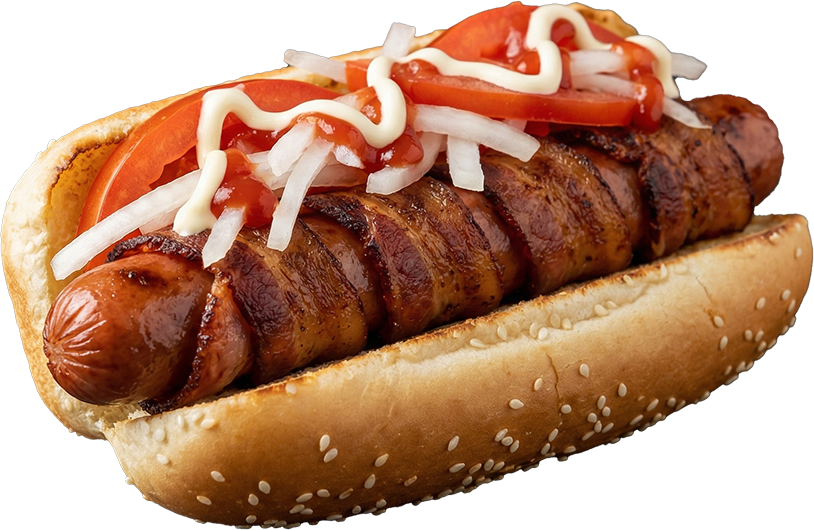 Salchicha con tocino, jitomate, cebolla, mayo y ketchup.