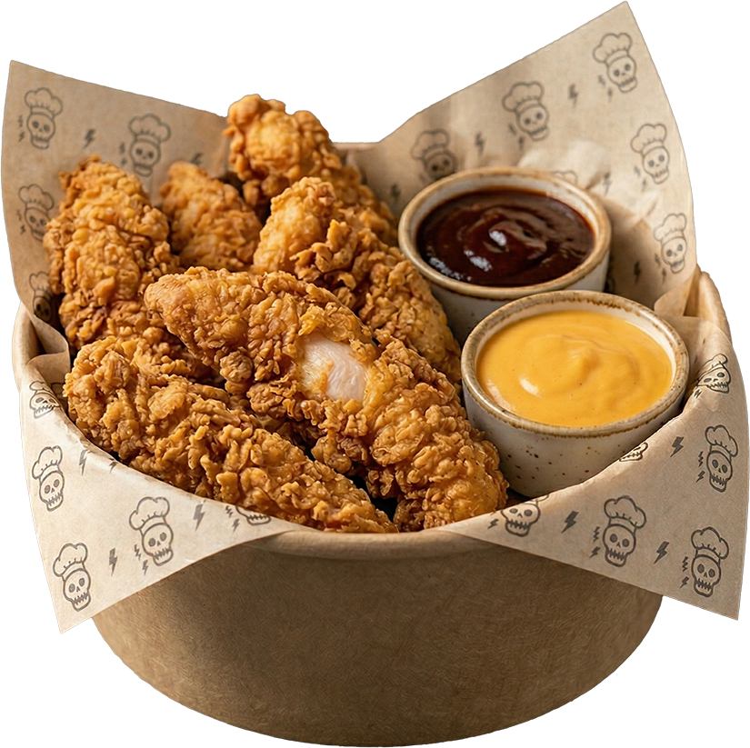 Tenders crujientes, queso americano, lechuga y aderezo calavera.